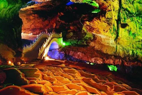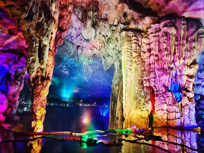上层有高达30多米的顶天柱、可容万人的仙人田广场等。最下层是蜿蜒曲折的地下河,河水静静地流向洞的深处。