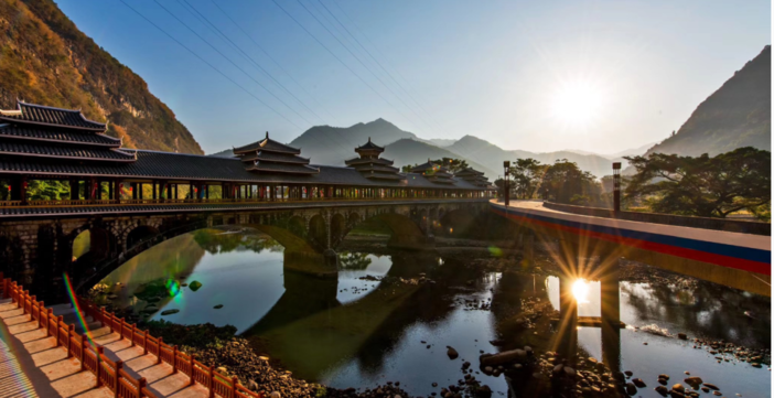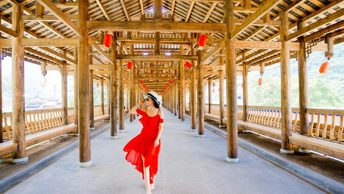 09:00左右网红“风雨桥”,在众多的风雨桥中,以亭楼式的风雨桥居多,这种风雨桥于长廊顶部竖起多个宝塔式楼阁,楼阁飞檐重叠,少的有三层,多的达五层。桥身庄重巍峨,如巨龙卧江,气吞山河,十分壮观。桥面两侧有精致的栏杆和舒适的座位,可供人们憩息。桥壁上或雕或画有雄狮、蝙蝠、凤凰、麒麟等吉祥之物图案,形象诙谐洒脱,古香古色,栩栩如生。