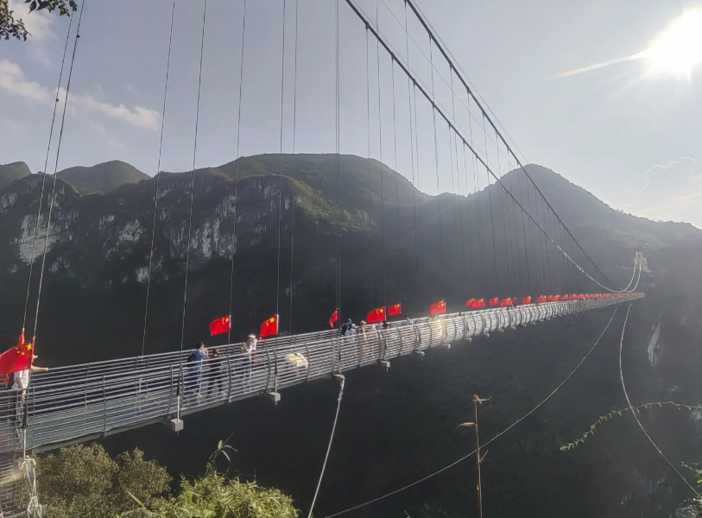 天云渡玻璃吊桥--单跨长度588米,悬空高差488米,为国内跨度较长、落差较高的高空玻璃桥。时常在云海之中若隐若现,宛如天上的鹊桥般神秘。
