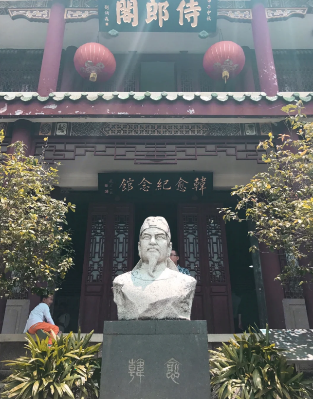 游览【韩文公祠】,即韩愈纪念馆。背靠韩山,面临韩江。韩文公祠倚山临水,环境清幽。祠堂现有三层殿阁。韩祠面宽18. 7米,祠体正面墙壁用坚实的水磨青砖砌筑。砖墙与梁桷衔接处,皆按不同弧线精工雕磨,使砖木紧密贴合。祠门上有石匾古隶书“韩文公之祠”。祠前有庭,进仅丈许,外砌石栏。祠分前后两进,头进门厅,后进是三开间大堂,比进升高2.5米,共深31.8米。中间小院,左右庑廊。祠内环壁嵌有明清以来的碑刻40通,正座塑有韩愈坐像
