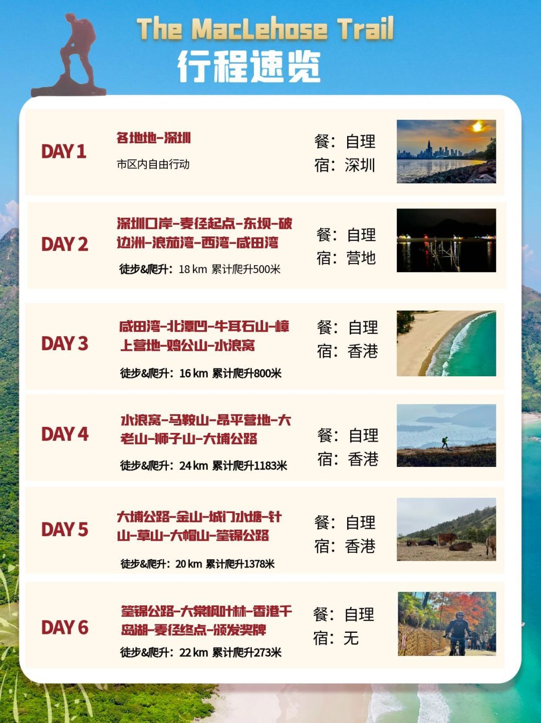 7:30 全员出发前往口岸过关,过关乘车到麦理浩径起点